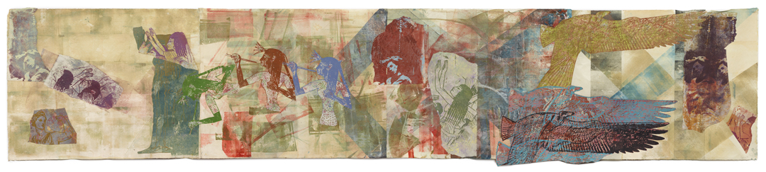Nancy Spero, Invocation, 1995, handprinting and printed collage on paper, 19.5 x 96.5 inches (49.5 x 245.1 cm).