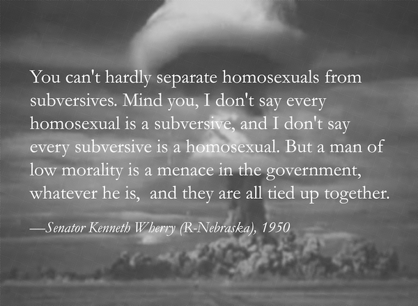 YF: The Cold War/anti-communist witch hunt is part of the mainstream American historical narrative but the Cold War/anti-gay witch hunt is still relatively unknown. When I discovered these quotations revealing the combined anti-communist/anti-gay rhetoric I was stunned. The inclusion of a gender issue within the anti-communist campaign shows to what extent homosexuality was equated with evil. Gay people of the 1950s found themselves very much in between the fighting empires.