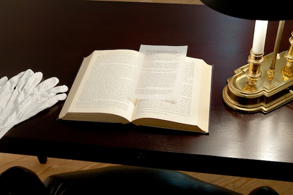 Yevgeniy Fiks, History of the CPUSA (Harry Hay), 2013, consists of a 1952 edition of History of the Communist Party of the United States by William Z. Foster, with inserts about the life and work of Harry Hay (1912–2002). Installation detail. Photography by Etienne Frossard. Courtesy of the artist and Winkleman Gallery.