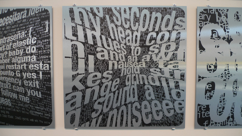 KMQ: As you say – interference does not always result in a confused state of being. With our own free-form conversation, which presumable could have led us anywhere, we have now landed where I hoped to go next: that is, the method and means of your work! You scavenge, collect, and find space for a limitless supply of random triggers: articles, words, signs, thoughts, ideas, and existing visual stimulus that comes from a wide range of information sources including the web, social networking, news media, advertising, informational brochures, small objects, and texts whether literary, popular, or intellectual. These clips are kept in boxes, almost like a trove of abstract treasures to bring out when you set to work on an installation; it can take days to see it through, as you meticulously draw a visual thread from a random assortment of detritus, as you refer to them. Why is this detritus? A wearing out, rubbing down, disintegration, refuse…