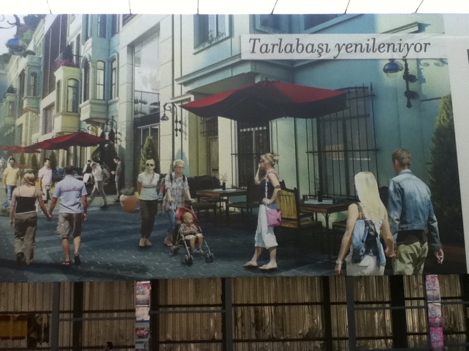Nevertheless, a section of Tarlabaşı recently experienced the demolition of several hundred buildings, and will be re-conceived as a posh enclave with residences, offices, and cafes, whose rising prices threaten to force out its existing residents. The demolitions, which as of this writing have not been followed by new construction, give the appearance of a warzone. Garbage piles up in partially gutted buildings while in contrast giant posters depict the future Tarlabaşı, replete with fancy new buildings, expensive cars, and light-skinned, sharply dressed professionals scuttling about in the midst of it all. Going where?