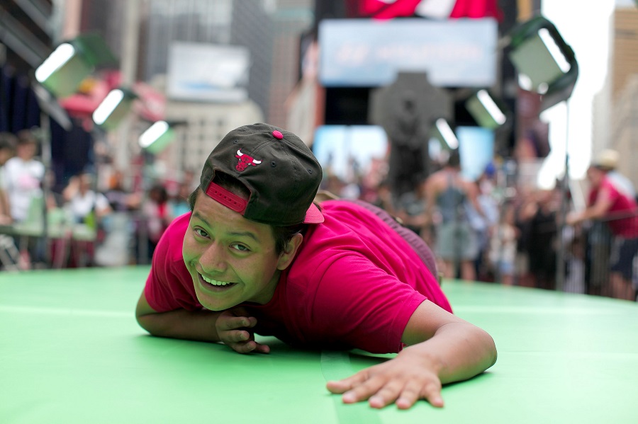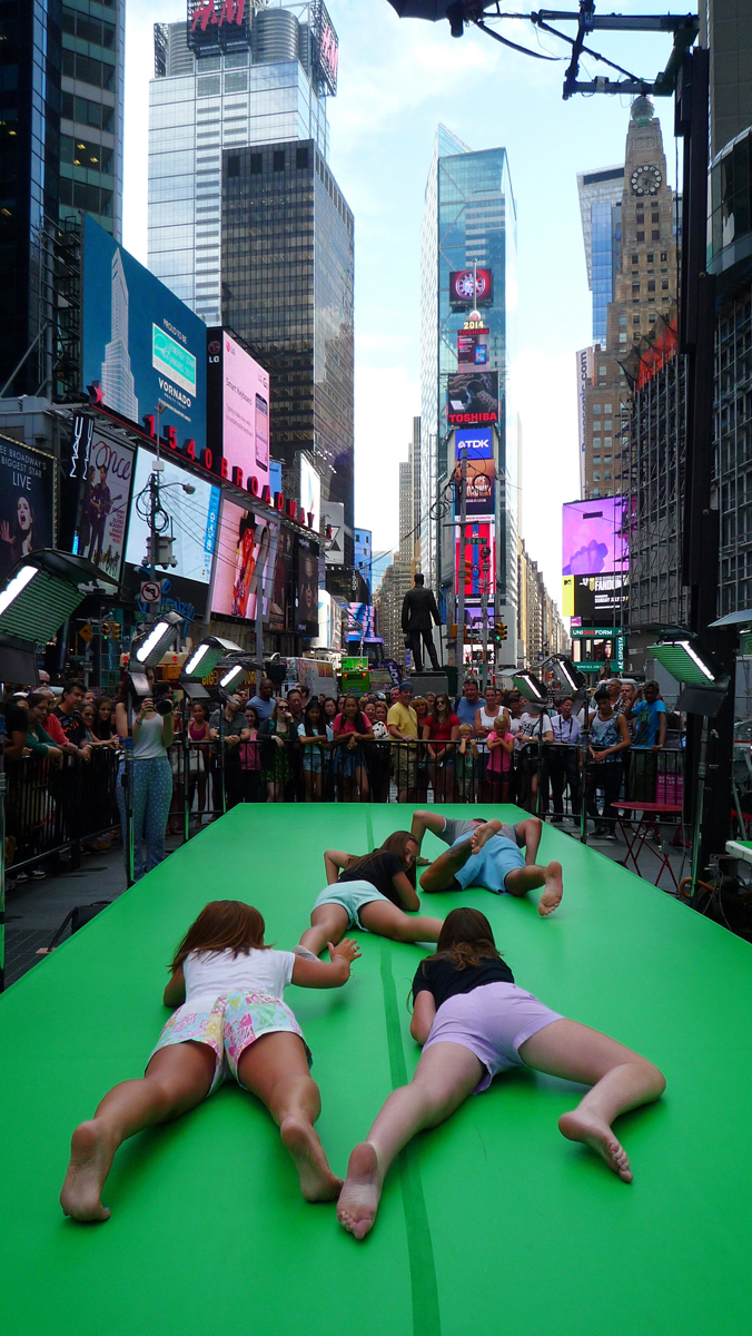 DC: Yes, I like that word “agency” and since there is an effort to crawl along the green screen space – not for the four year olds but for anyone else – this effort translates on the screen as a struggle to climb. One individual viewing the piece suggested that New York City is known as a place where you want to succeed, to reach the top, and if you make it here, you can make it anywhere. In this reading, gesture and motion becomes a metaphor for the collective helping the individual to reach the top. This makes a lot of sense in Times Square.