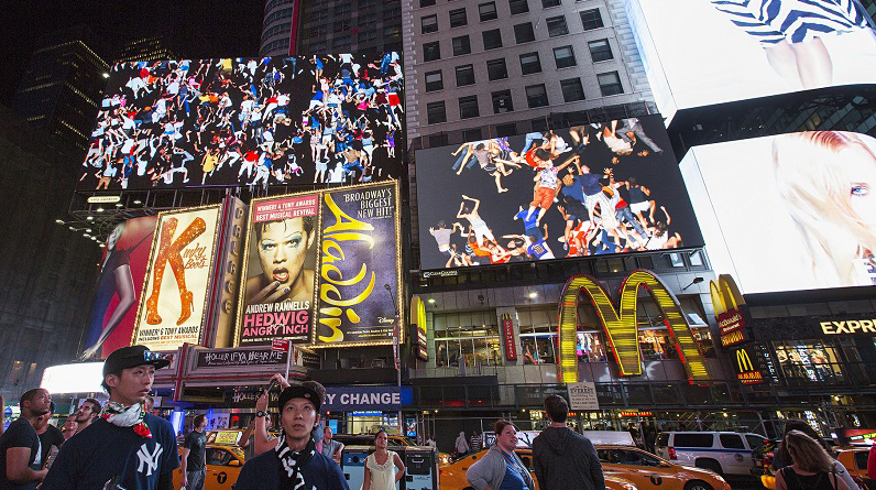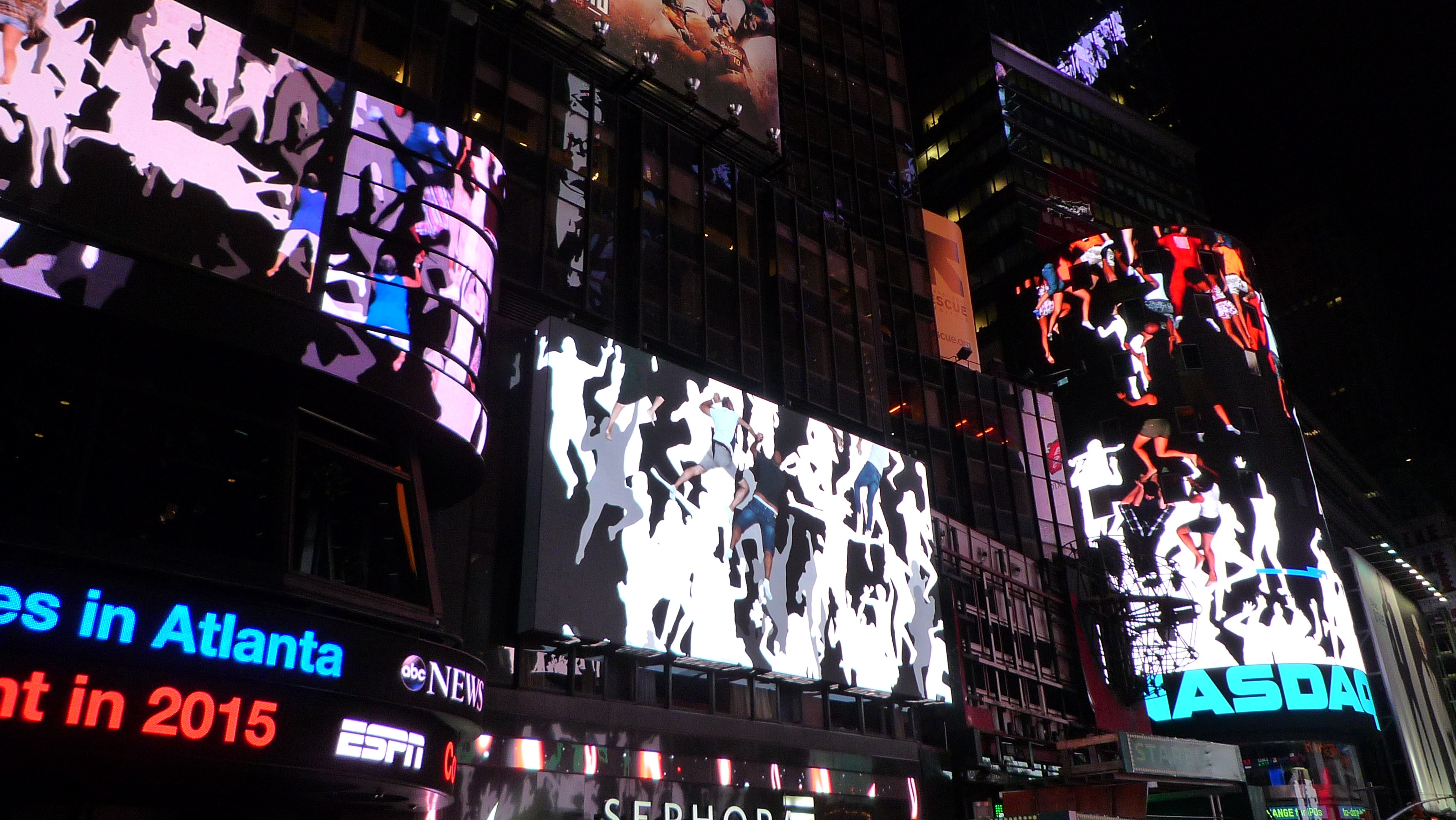 Midnight Moment: Daniel Canogar, Storming Times Square, 2014. Photograph by Chris Romero for bitforms Gallery.