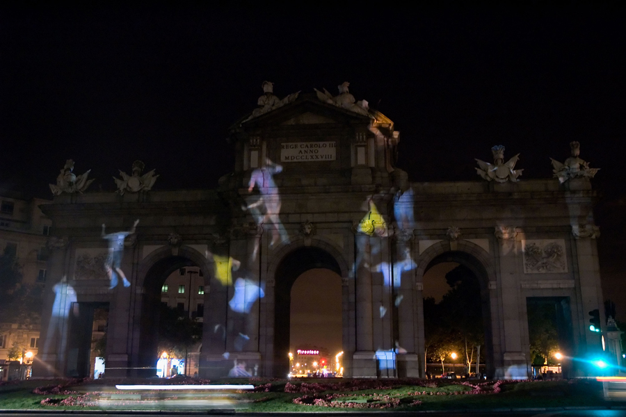 But the title itself refers to revolutionary upheavals: the storming of the Winter Palace or the storming of the Bastille. My first public projection was here in Madrid, on the Puerta de Acalá, which was a gateway or threshold where passage into and out of the city was once controlled like our borders today. While I was shaping my ideas for this project, the media was full of stories of sub-Saharan Africans trying to cross into Spanish territory in northern Africa. Individually these refugees would not have a chance but by overwhelming the authorities, which had orders not to harm them, they could cross the border. I could identify with this action: we are all intruders in a kind of way, climbing fences, trying to improve our lives. It was this collective effort that made a difference and that increased the individual’s chance for success.