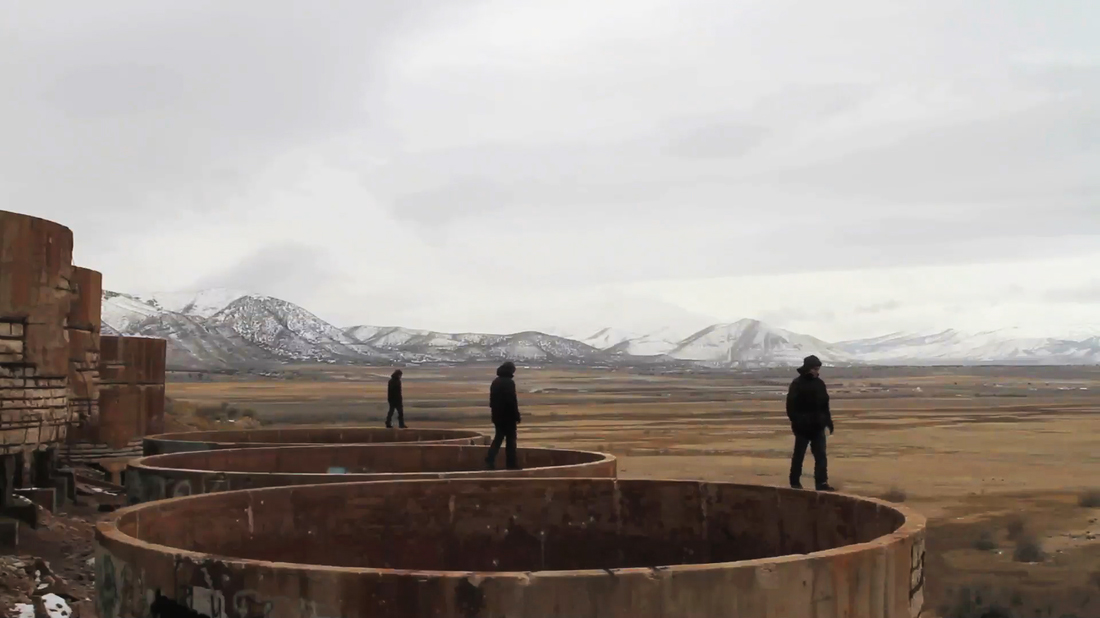 Wilkinson creates an interface between her own image and that of the natural world in a fluid, womb-like vision that holds within it the inter-dependency of all life forms to the fate of the earth. Ben Hagari’s (Israel/USA) Fresh (2014) reverses expectation by placing man as the substrata for earth’s abundance in a succulent dialectic between plenitude and entropy: while vibrantly colorful insects feed on the body of an Arcimboldo-inspired man, music is made from the harvested fruits of this bounty. Destiny encircles thoughts, words, and actions in Akina Cox and Joseph Imhauser’s (USA) cross-generational portrayal of some of Meryl Streep’s most memorable characters in The Three Witches (2014), while tripling serves a more sacral expression of unity in David Hawkin’s The Library of Babel (2012). His meditative (and simultaneous) circumambulation of three former mineral leaching tubs is set in a landscape so sublime, one is almost thankful for its atmospheric distance. Ruins of capitalist enterprise transform implicitly through artistic intervention into devotional kivas or a temple’s foundation.