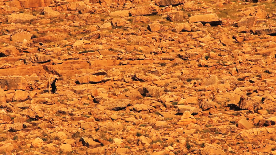For Jacques Rancière, it’s a question of a double effect: “the readability of a political signification and a sensible or perceptual shock caused, conversely, by the uncanny, by that which resists signification.”[8] Derrida’s frame, for example, is itself “a metaphor for the limits or rules of exclusion placed on discourse.”[9] We see in Demet Taspinar’s Where To? (2009) as well as in Noor Abed’s We Both Know (2013) a willful disregard of the integrity of the picture frame to intimate the permeability of boundaries as well as the blind spots of our vision. In 1983 Shohei Imamura filmed The Ballad of Narayama whose protagonist Tatsuhei must carry his mother Orin to the mountain to die of starvation, a traditional practice known as ubasute. Noor Abed takes Imamura’s indelible image of body transporting body across an inhospitable landscape but rather than use cinematic standards of variable viewpoints, she maintains the distant view of surveillance. We bear witness from a remote, solitary position to the diminutive human figure carrying, in this case, dismantled pieces of an android, both folded into the black shadows and red stones of the hillside.